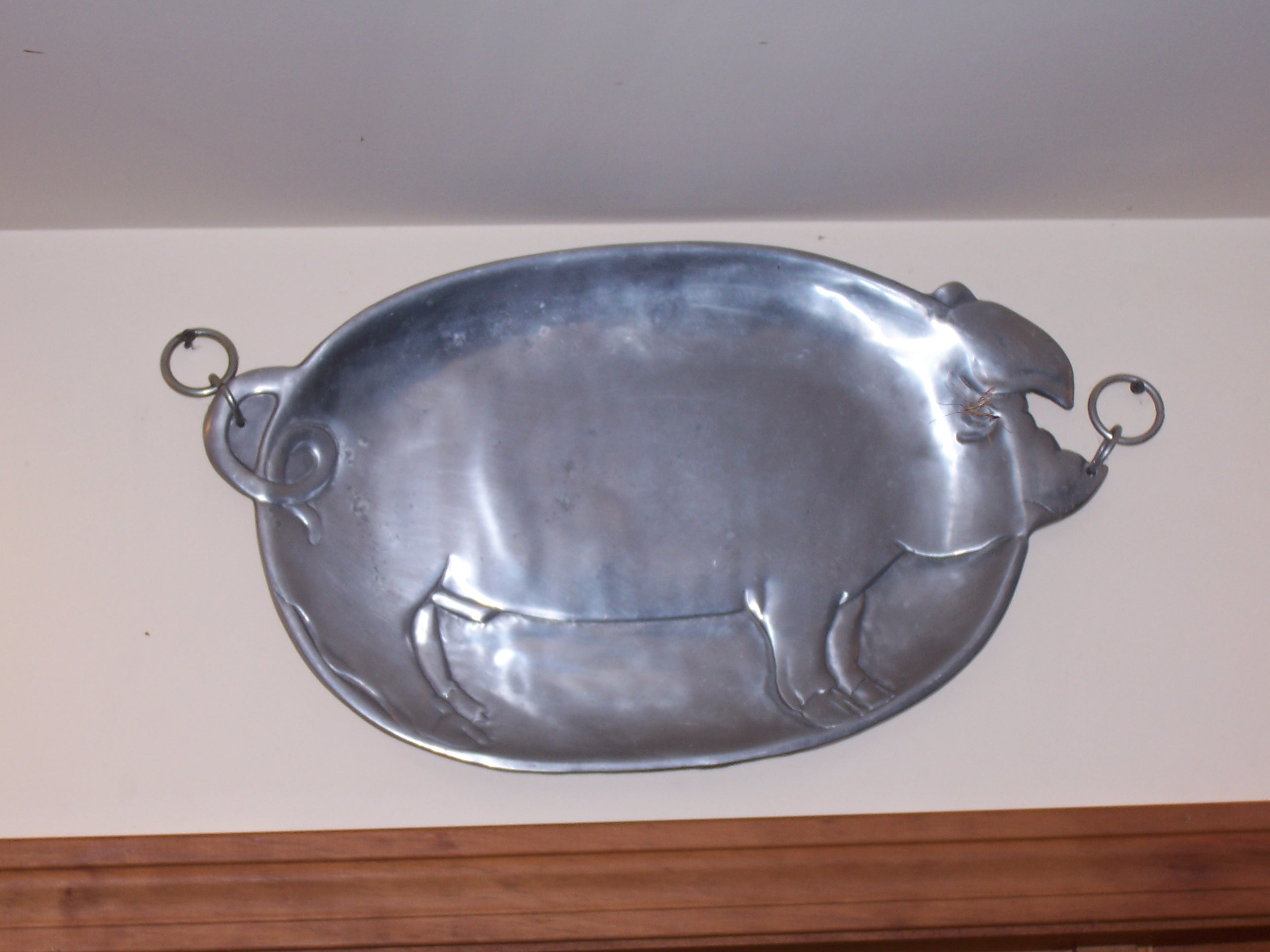 It was an interesting find, to say the least. (The “free to a good home” pile is typically chock full of glass vases and kiddie toys. I typically don’t even bother to look at that particular section of the dump because I’m usually focused on getting rid of my own junk.) I wasn’t sure why it had two rings near the snout and tail. It technically looked like a platter, but it also looked like something you could hang at the entrance of a farm. I wasn’t sure I would ever use it to serve cheese and crackers, and certainly not any pork products. Regardless, I needed to have it.